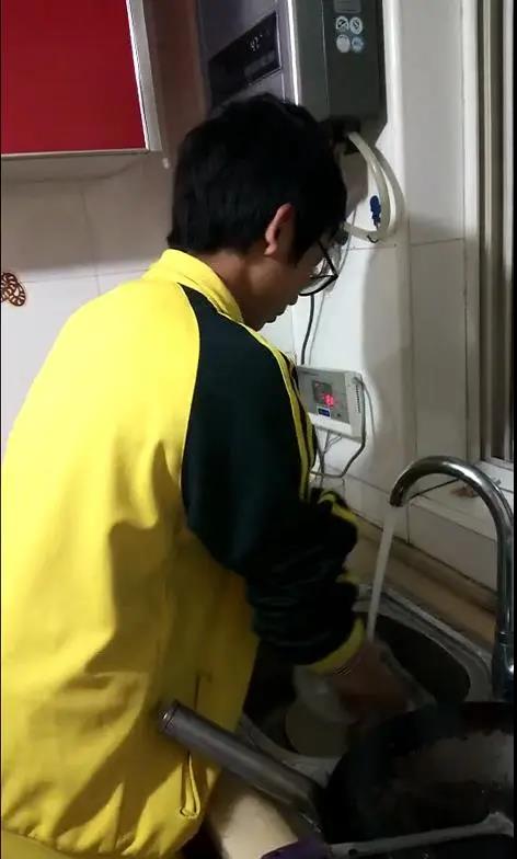 小盛性格靦腆,乖巧懂事,正在幫媽媽洗碗
