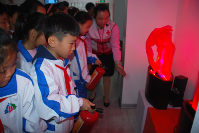 洛陽路第一小學的學生學習滅火器的正確使用方法