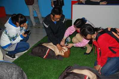理工大學的學生在講解員的指導下學習心肺復蘇的正確方法