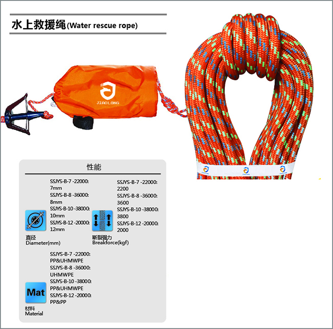 水上救生包內(nèi)繩索采用鮮艷的橘紅色或橘黃色亮色系為主,具有反光和夜光功能、高亮和警示功能。