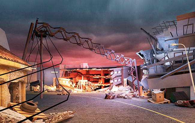 再現地震后,道路變形,有波浪狀也有斷裂上下錯層的場景。在道路兩側有建筑物倒塌,形成通道。體驗者從破損的通過穿過,到達一個相對安全的位置。在臨近出口處,設置一條斷掉的高壓電線掉落在地上,要求體驗者此處應該采取單腳跳的方式離開此區域。