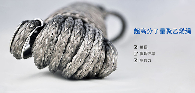 超高分子量聚乙烯纖維材料制作的越野絞盤繩,比同直徑鋼絲絞盤繩強度大,而且重量僅為鋼絲繩的1/8,延伸率低,強度高。