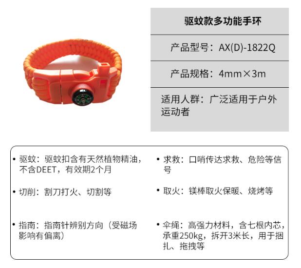 產品展示 當前位置:首頁 > 產品展示 > 戶外用品,防火救生繩及特種繩纜 > 戶外應急必備系列 > 驅蚊款多功能手環